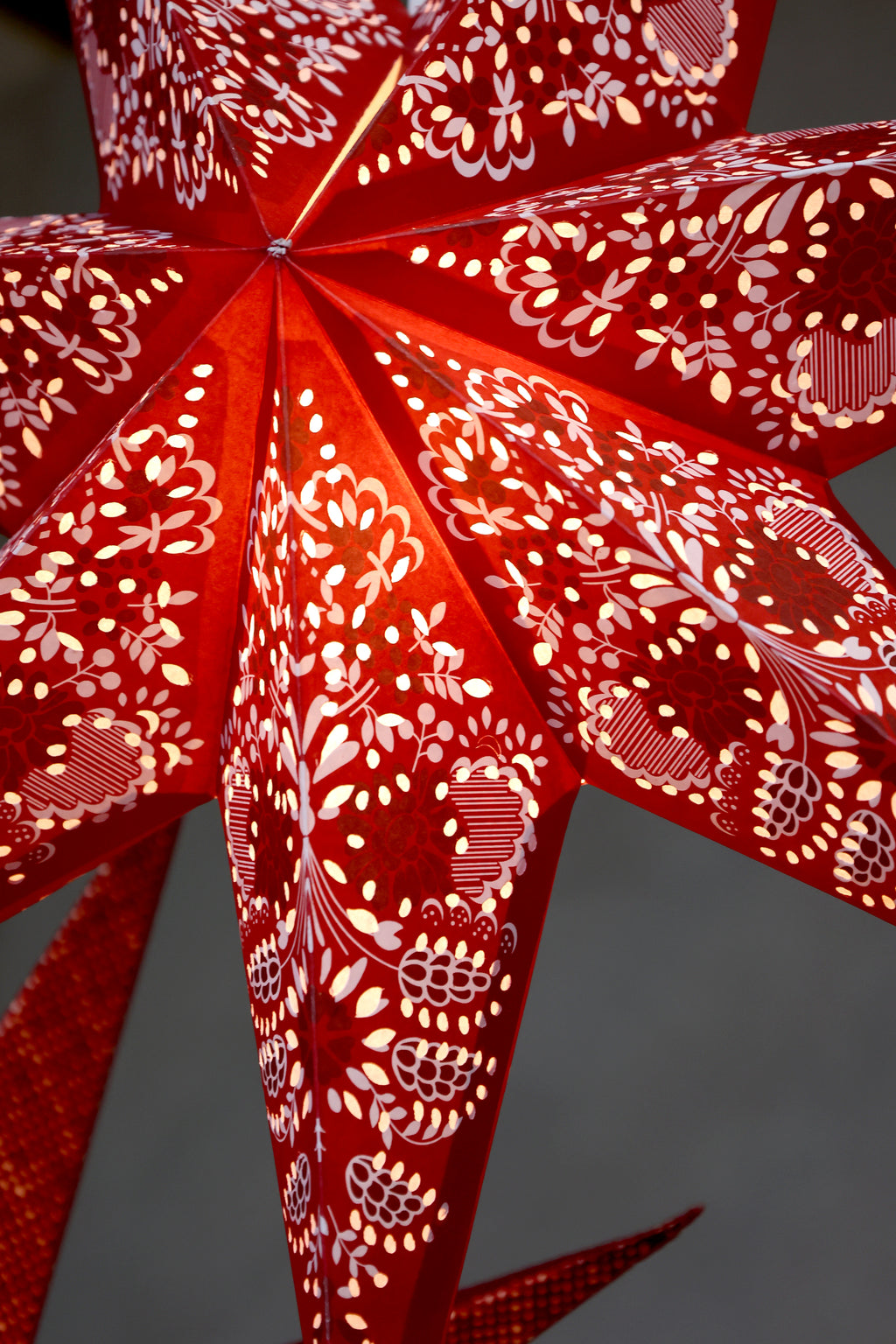 Kaunis tähti vahvaa kartonkia, paljon reikiä, joita peittää ohuempi paperi, joten valo loistaa kauniisti niiden läpi. Laita halutessasi sisälle patterivalot tai erillinen katkaisimella varustettu johto polttimolle.