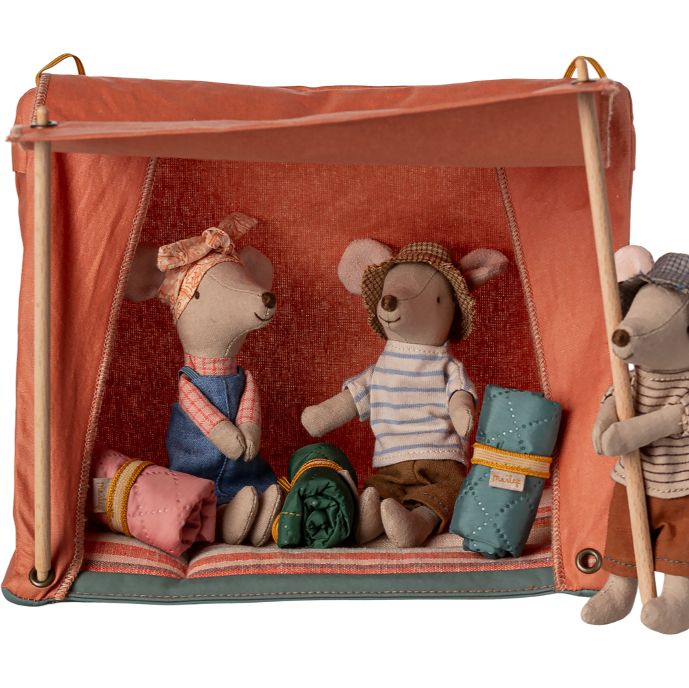 Mailegin teltta.Teltan pohjassa kiinteä patja. Teltan eteen saa hupun, jolloin teltta on suljettu. 22cm leveä, 15cm syvä ja 19cm korkea.
