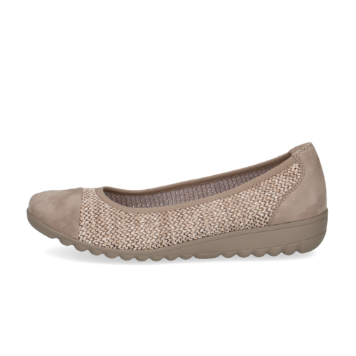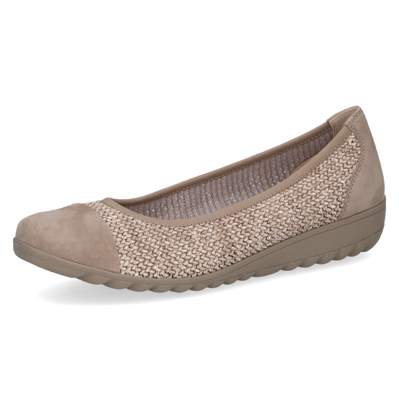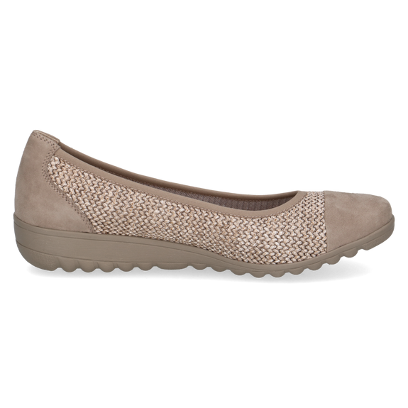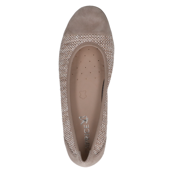 Capricen tuttu balleriiinamalli. Hyvä, pitävä pohja, jossa hiukan kantaa. Irrotettava, miellyttävän pehmeä nahkapäällysteinen sisäpohjallinen. Takana ja edessä nahkaa, keskiosa kaunista punottua materiaalia. Joustava reunus, joten pysyy hyvin jalassa.