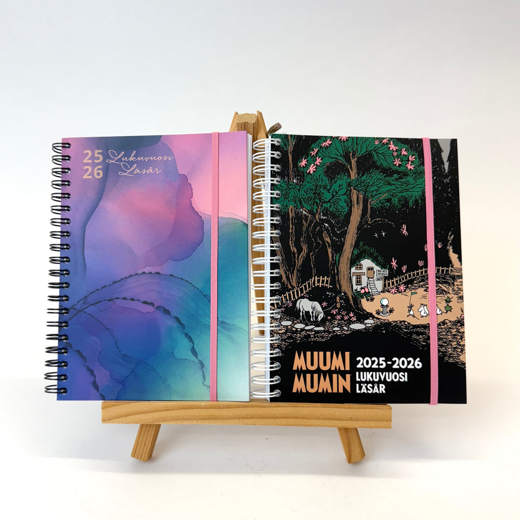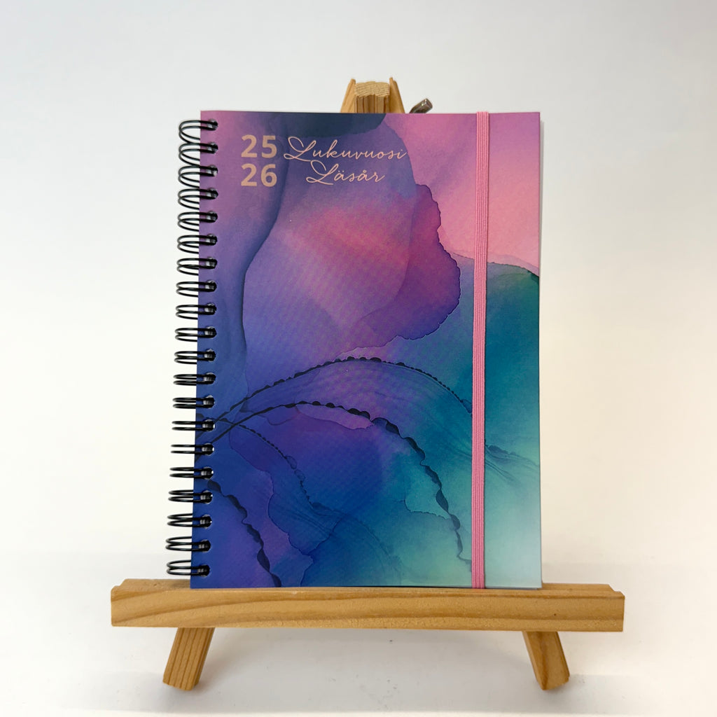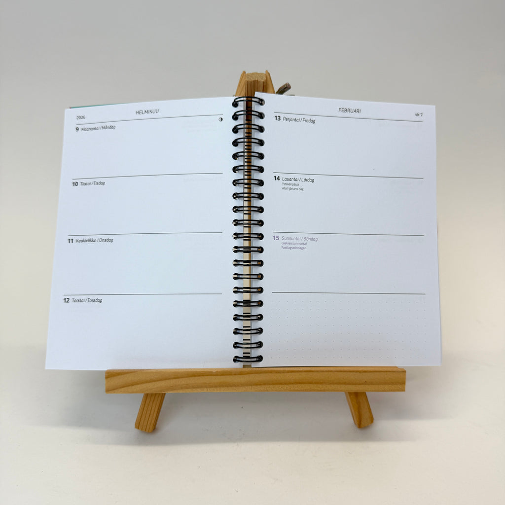 Pehmeäkantinen lukuvuosikalenteri, jossa vikko yhdellä aukeamalla.