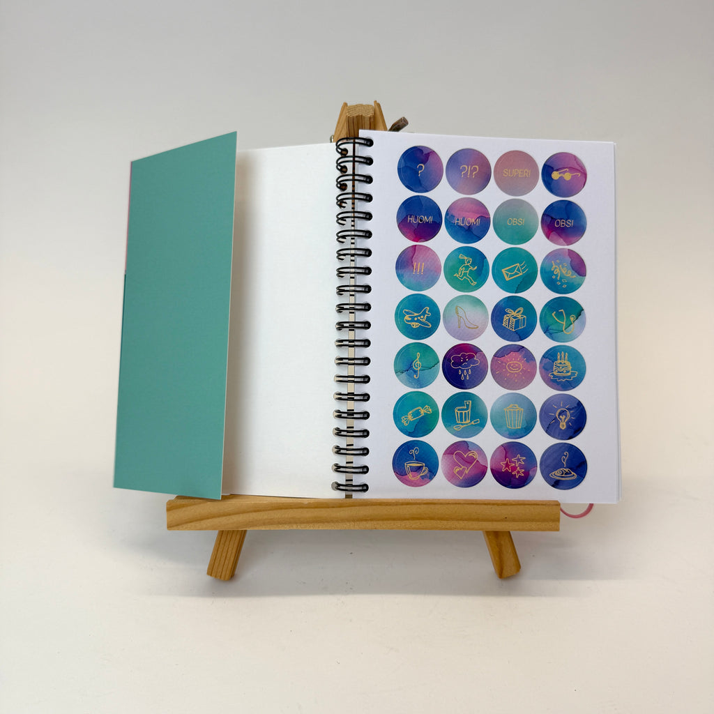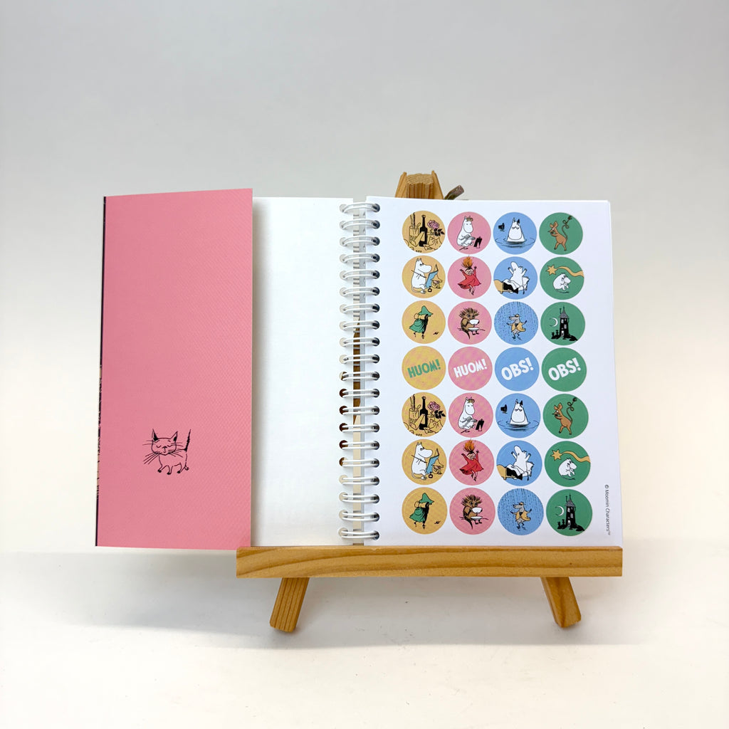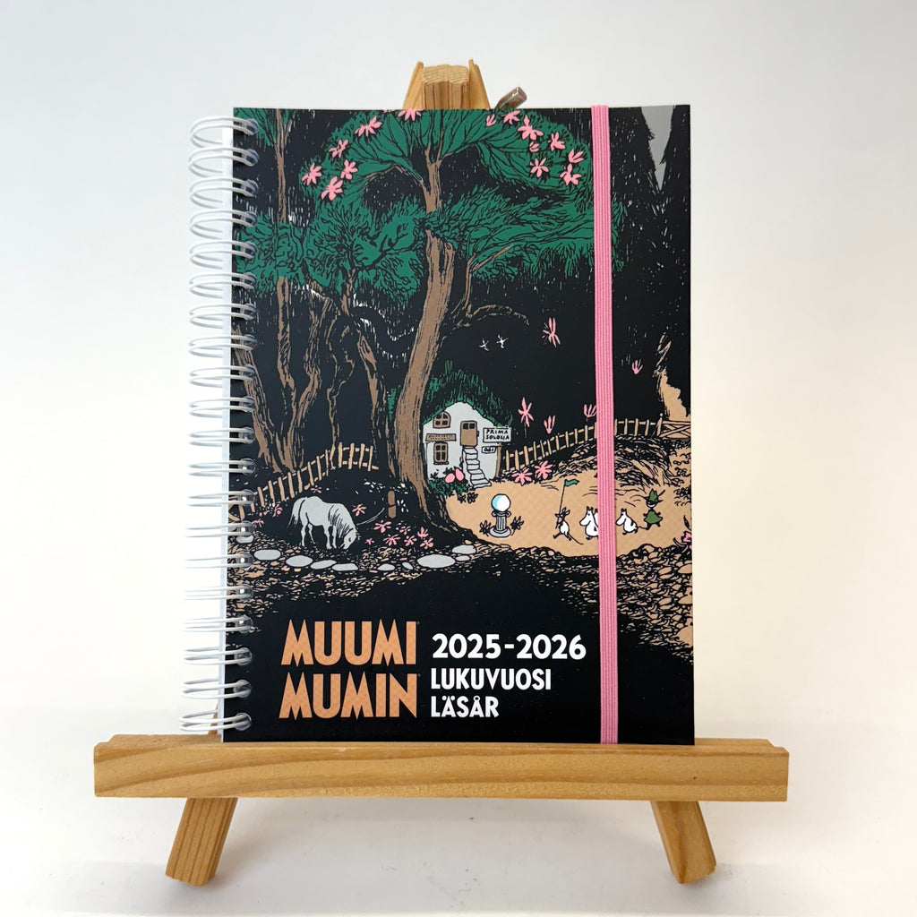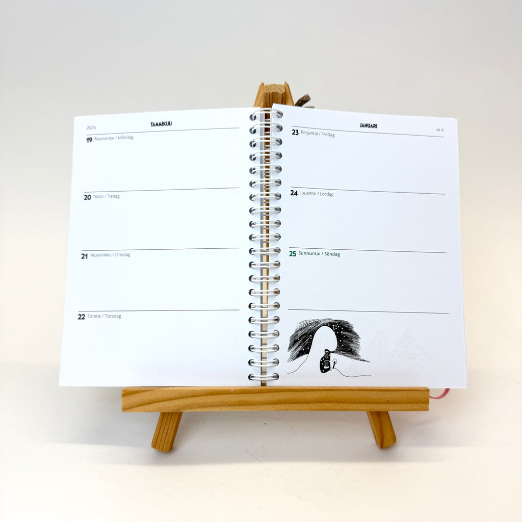 Pehmeäkantinen lukuvuosikalenteri, jossa vikko yhdellä aukeamalla.