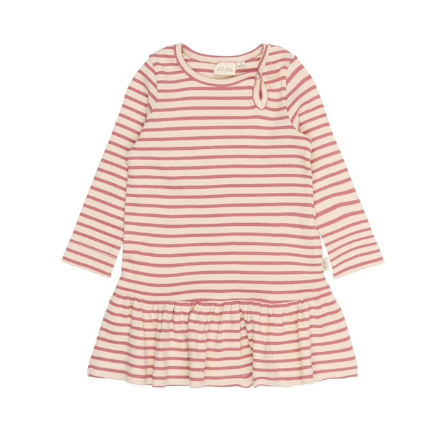 Pitkähihainen raitamekko ihanan pehmeää ja joustavaa materiaalia. Pääntien sivussa painonappi. Materiaali 48% luomupuuvillaa, 48% modaalia ja 4% elastaania. Pesu 30 asteessa.