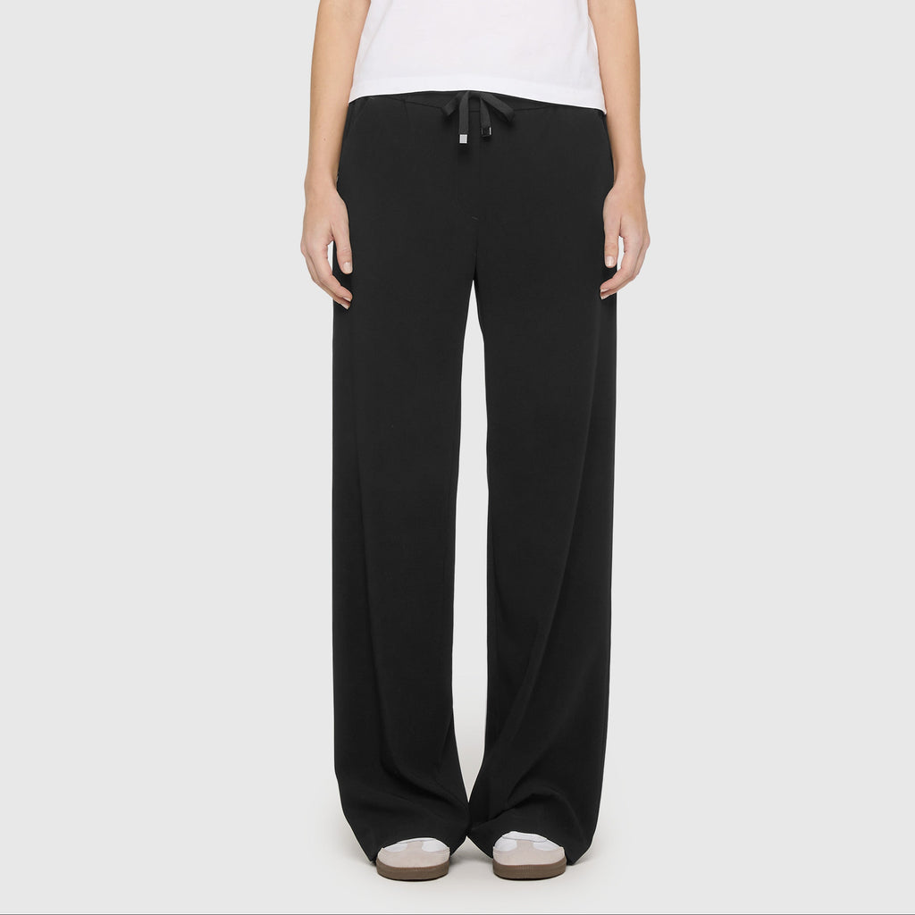 Housut kauniisti laskeutuvaa materiaalia. Suora leveähkö lahje, kuminauhavyötärö kiristysnyörillä. Sivuilla taskut, takana piilotasku. 91% polyesteri, 9% elastaani, hienopesu 30 asteessa.