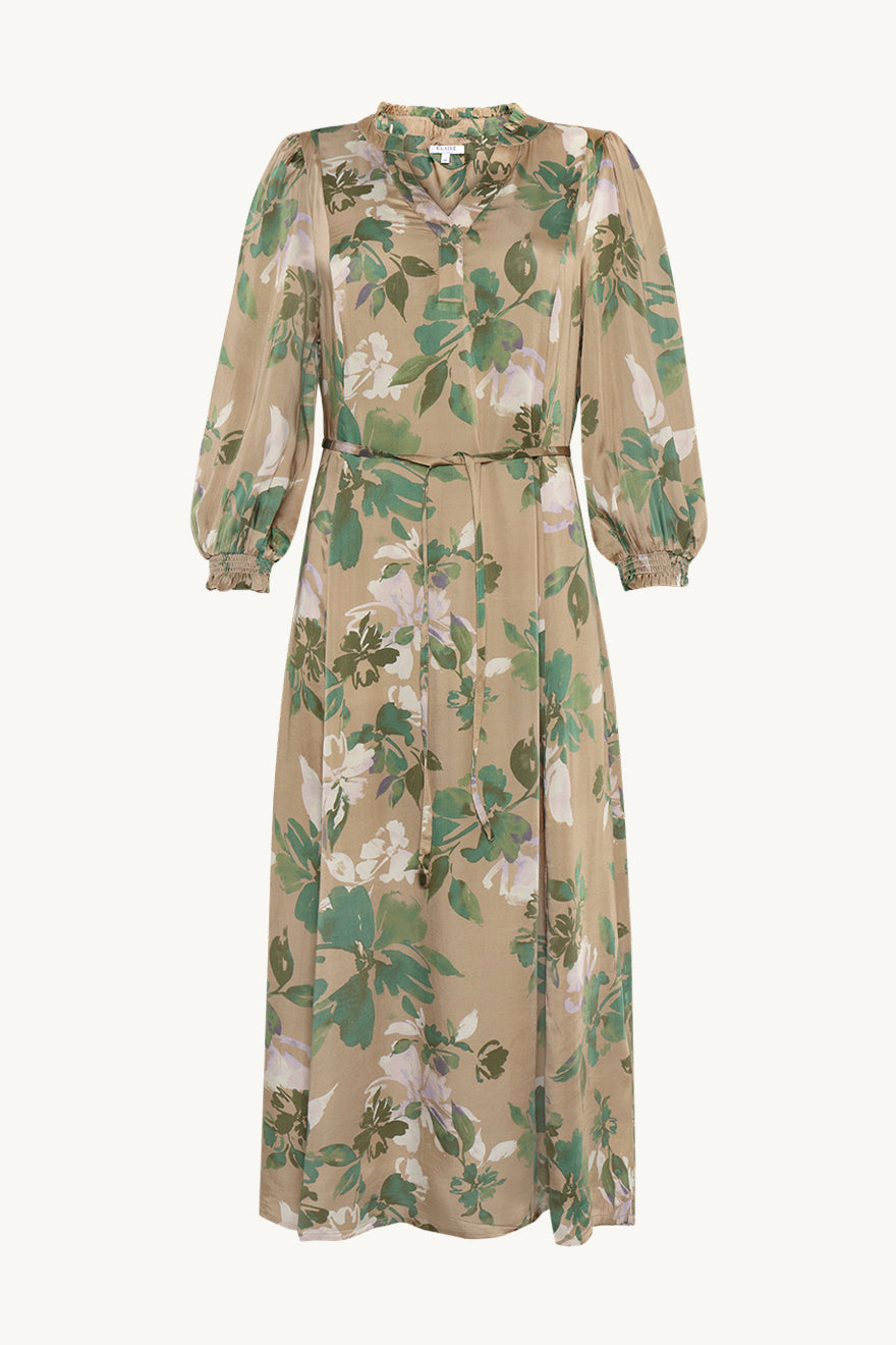 Mekko kauniisti laskeutuvaa viskoosilaatua. 3/4 mittaiset hihat joissa smokkirypytys, V-pääntie pienellä pystykauluksella. Alaspäin levenevä malli. 100% viskoosi, hienopesu 30 asteessa.