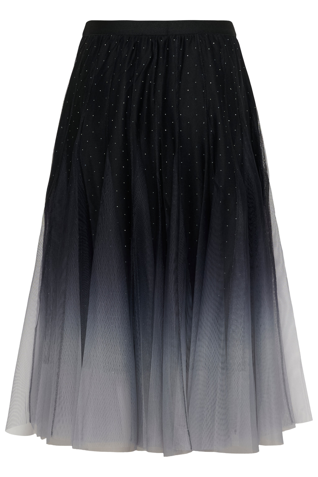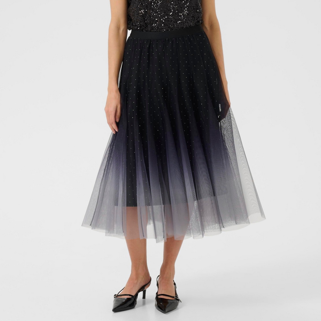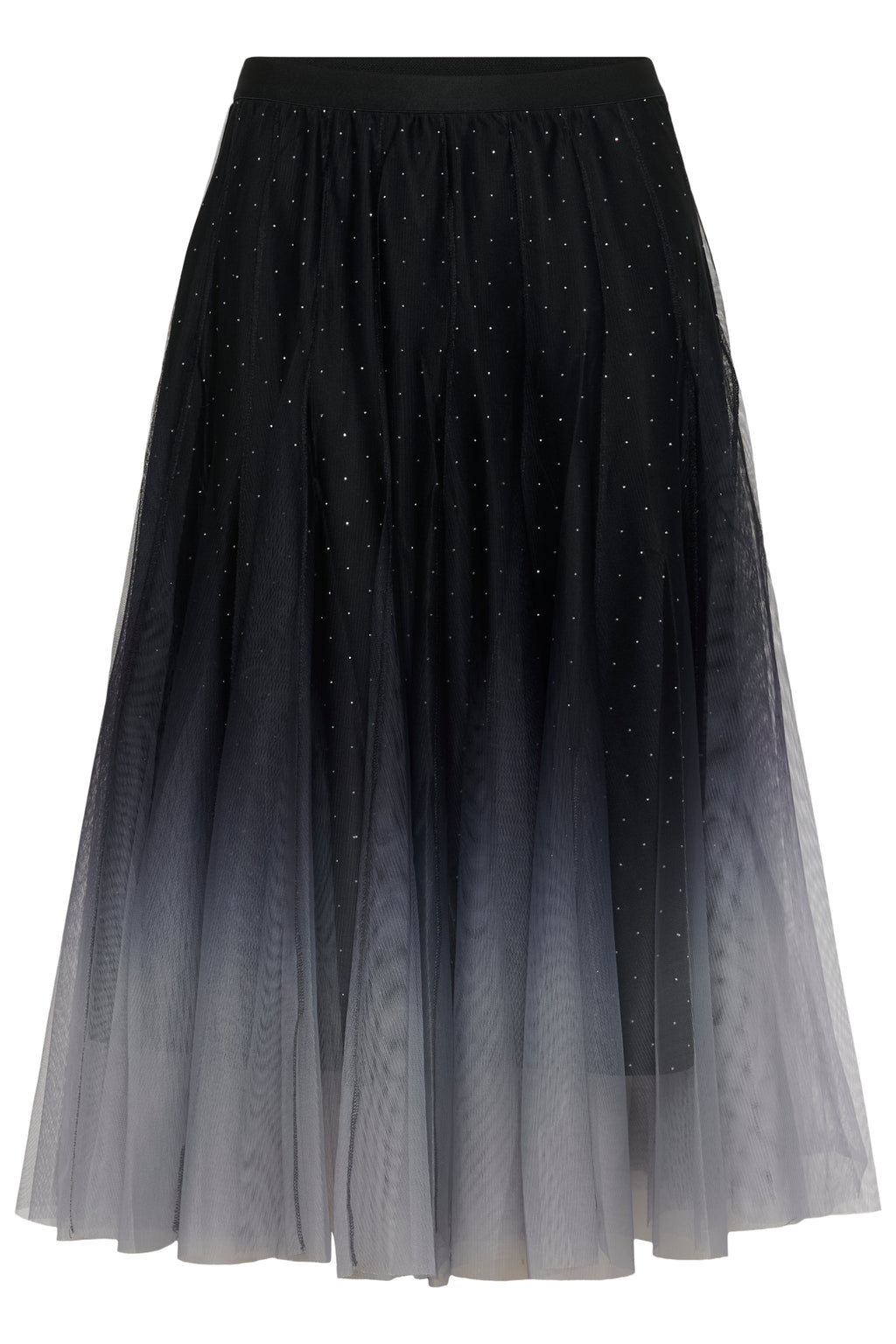 Kauniisti liukuvärjätty tyllihame jossa lyhyt blingbling alushame. Joustava kuminauhavyötärö. 95% polyesteri 5% elastaani, alushame 100% polyesteri. Hienopesu 30 asteessa.