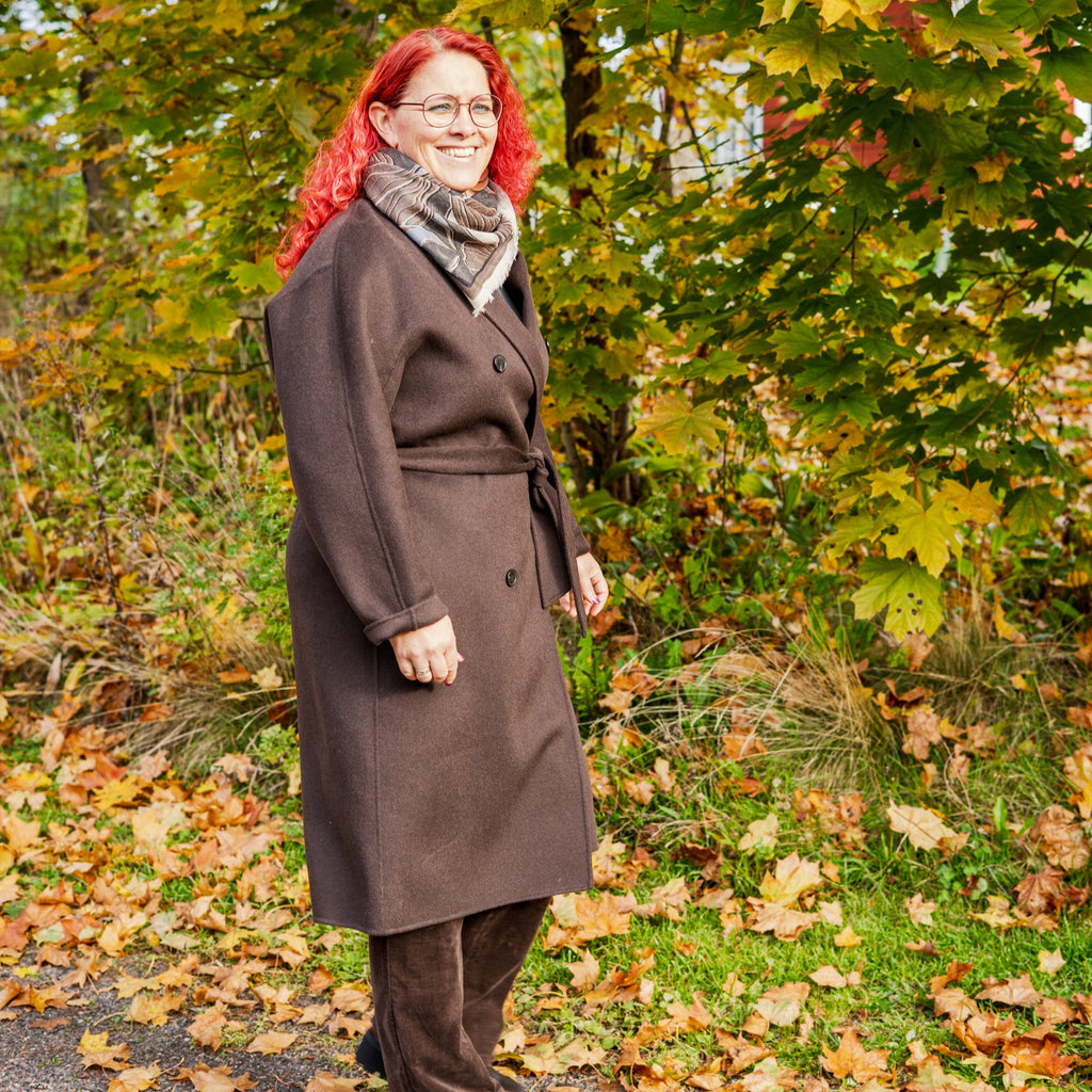 Vuoreton kauluksellinen villakangastakki, kaksirivinapitus, sivuilla taskut. Vyötäröllä solmittava vyö. 50% villa 48% polyester 1% polyamidi 1% viskoosi, ei vesipesua.