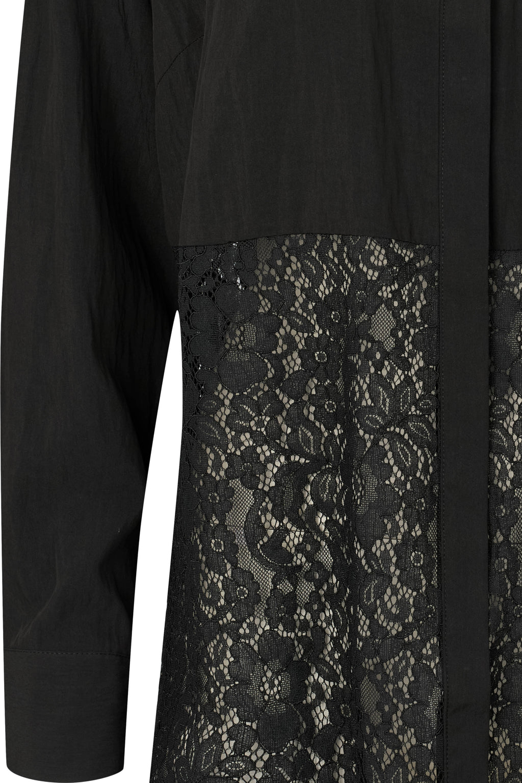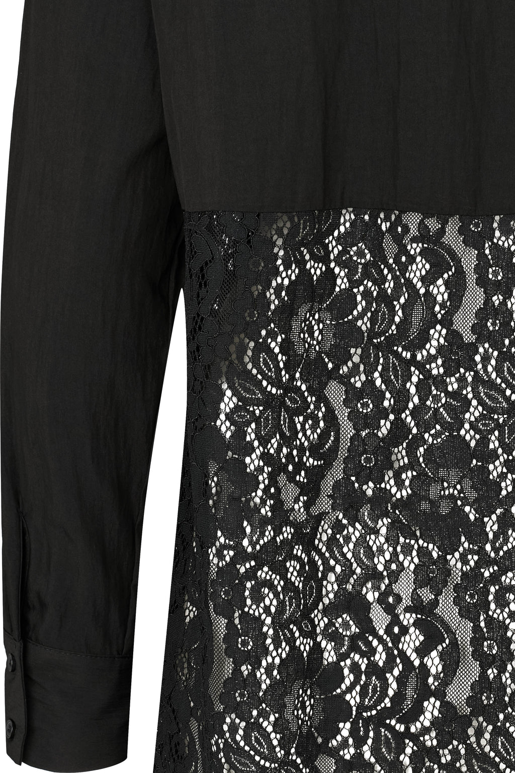 Kaunis, pitempi pitsipaitamalli, jossa alaosa kokonaan pitsiä. Piilotettu nappilista. 86% viskoosi, 14% polyamidi, pitsikangas: 50% puuilla, 50% polyamidi, käsinpesu, voi kutistua max. 5%.