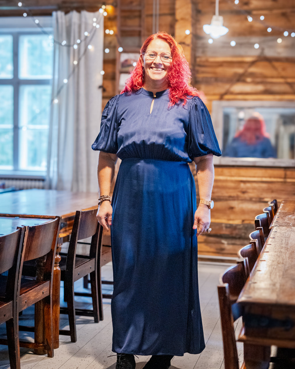 Kaunis yönsininen mekko laskeutuvaa viskoosilaatua. Poikkileikkaus hieman vyötärön yläpuolella. Pieni pystykaulus, edessä kultainen koristenappi. Takana solmittava nauha. Lyhyet hieman pussimaiset hihat. 100% viskoosi, hienopesu 30 asteessa.