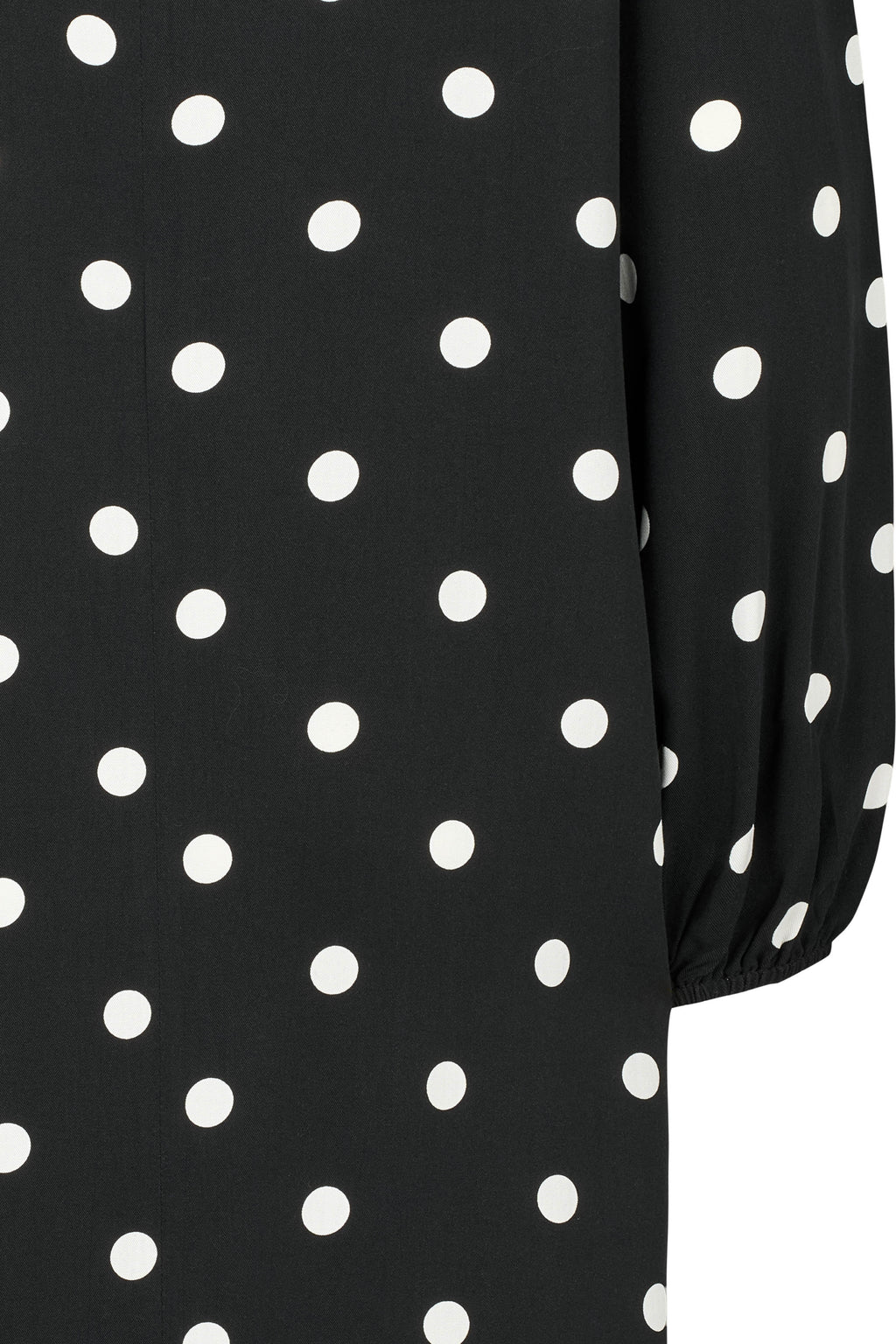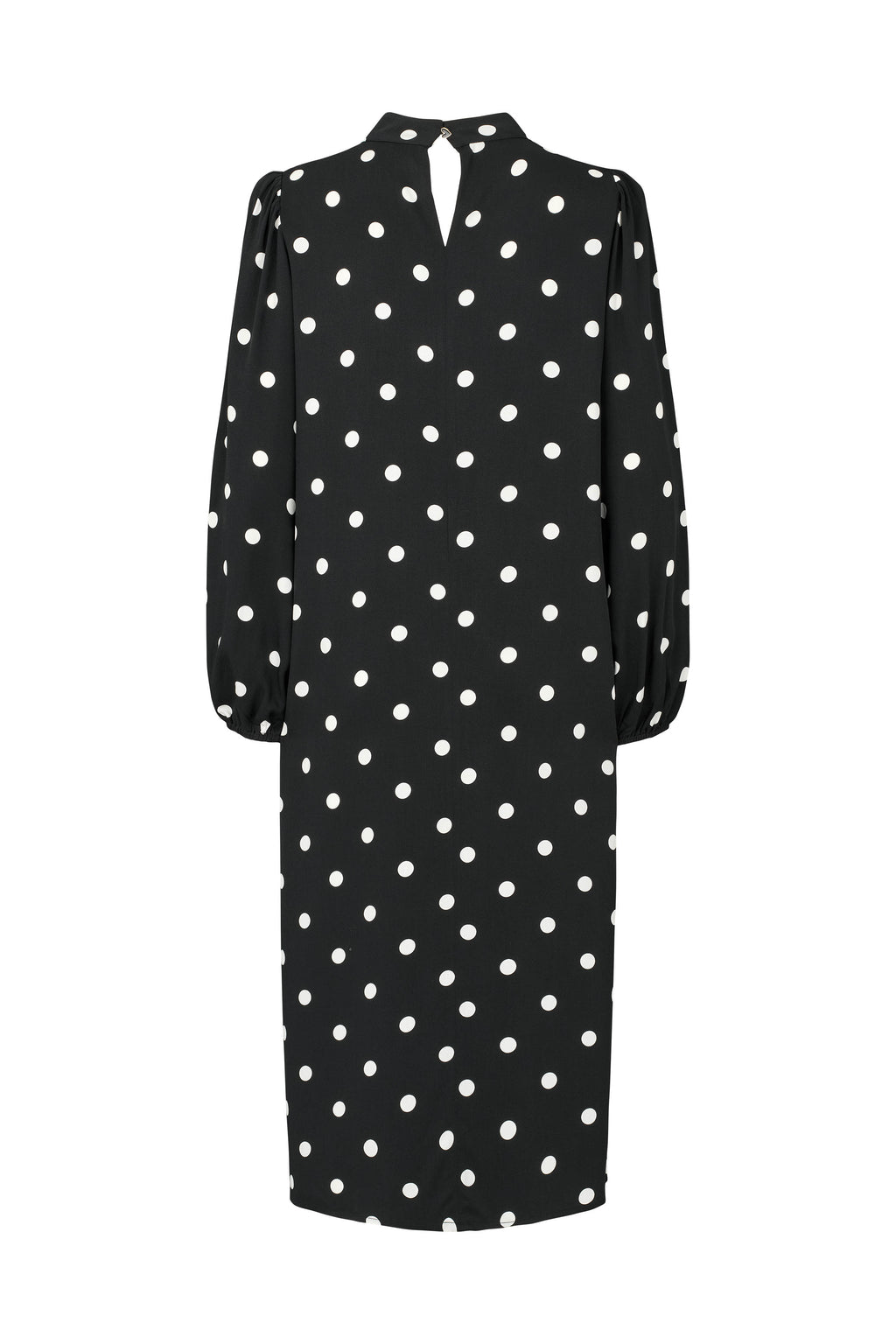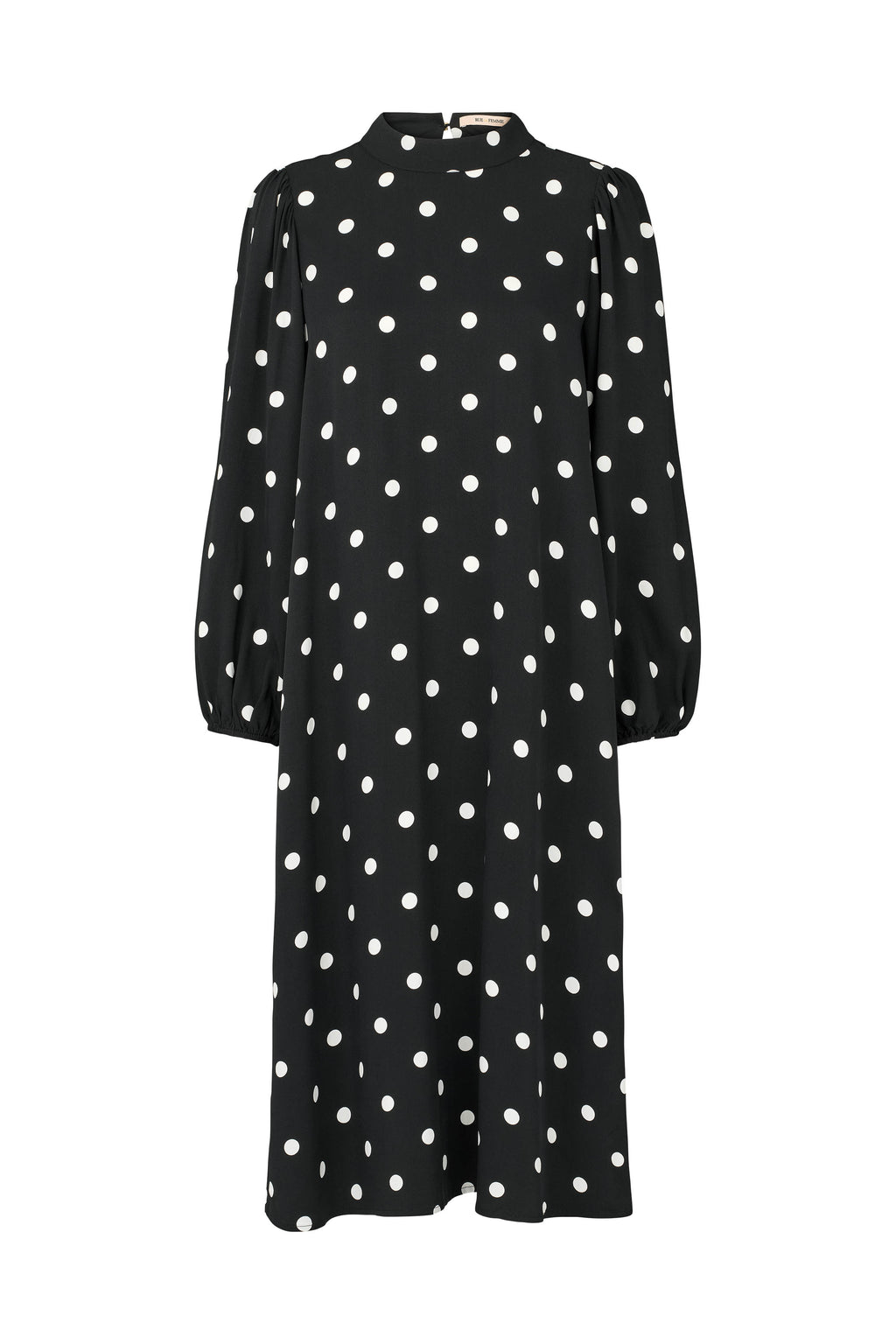 Kauniisti laskeutuva viskoosimekko, hieman alaspäin levenevä malli. Pystykaulus, niskassa aukko ja koristeellinen nappi. Olkapäillä rypytykset ja hihansuissa kuminauhakiristys. 100% viskoosi, hienopesu 30 asteessa.