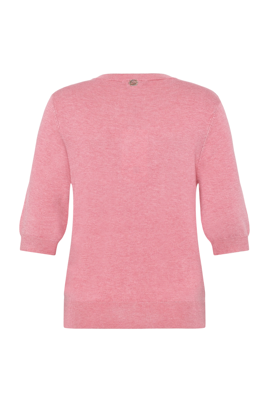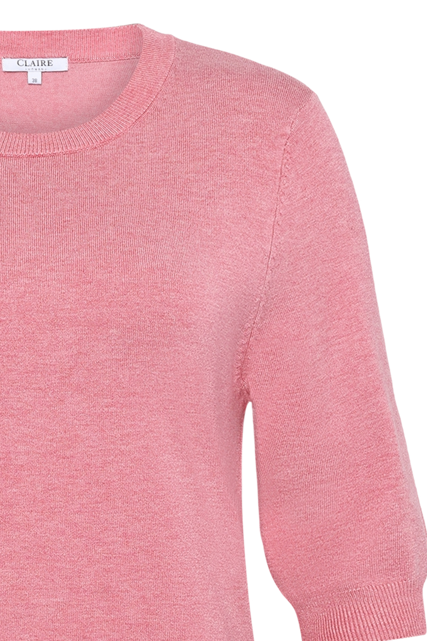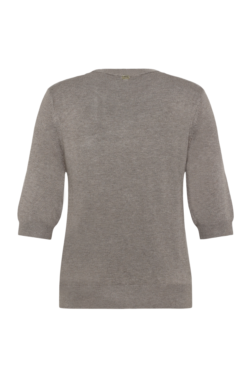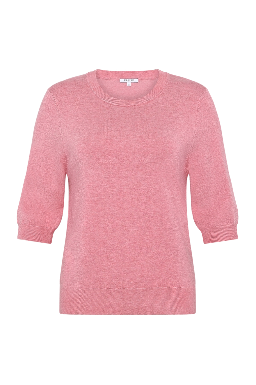 Lyhythihainen neule ihanan pehmeää viskoosilaatua, pyöreä pääntie. Resorineulos hihansuissa, helmassa ja pääntiessä. 82% viskoosi 15% polyamidi 3% elastaani, hienopesu 30 asteessa.