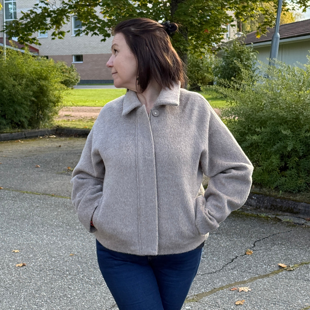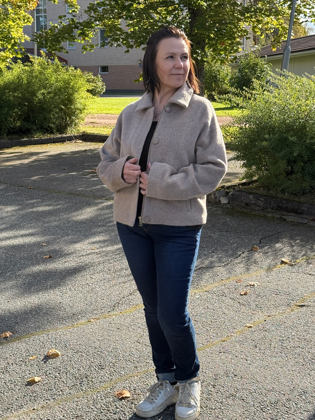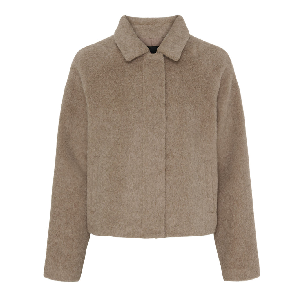 Tyylikäs lyhyt jakkumallinen takki, jossa upeat materiaalit. Edessä vetoketjukiinnitys ja nepparit, edessä sivuilla myös taskut. 80% villaa, 10% alpakka, 10% silkki.