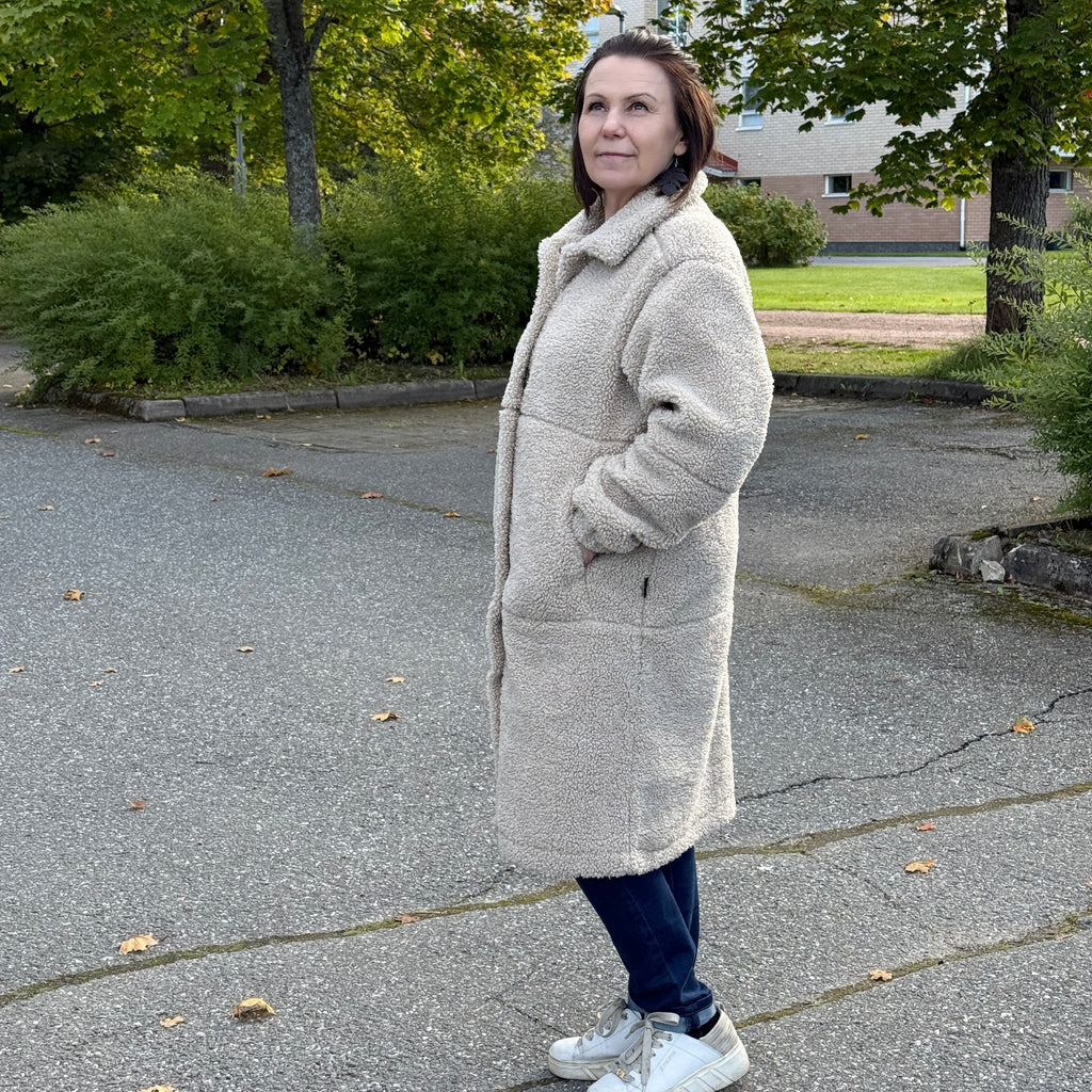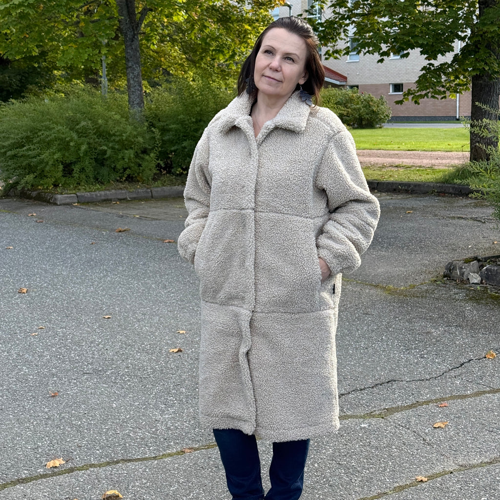 Pehmeä teddytakki piilonepparikiinnityksellä. Hihansuissa kuminauhat, rento, väljä malli. Edessä sivuilla taskut. 100% kierrätetty polyesteri, pesu 30 astetta.