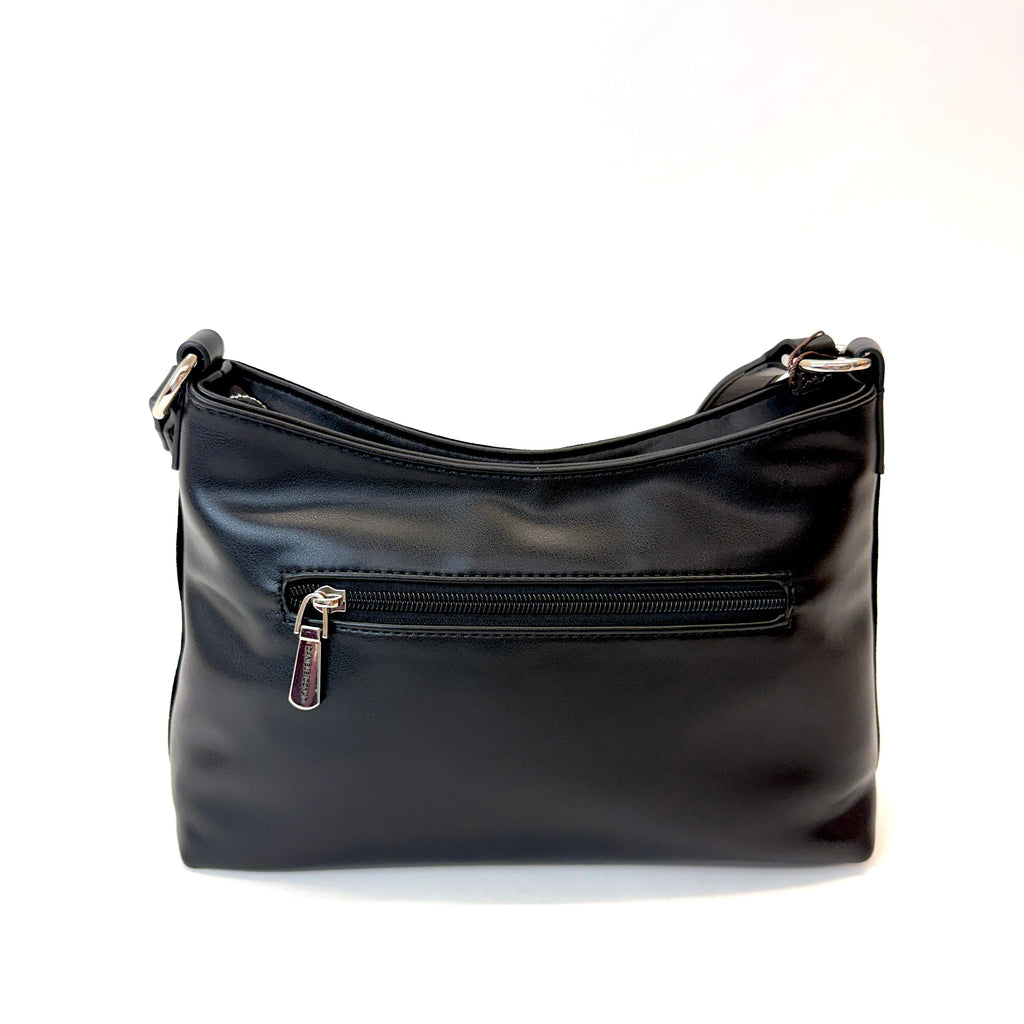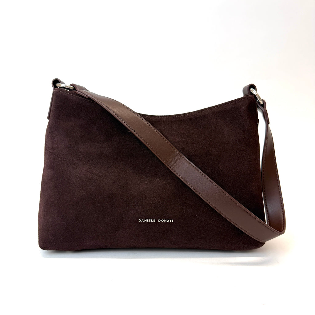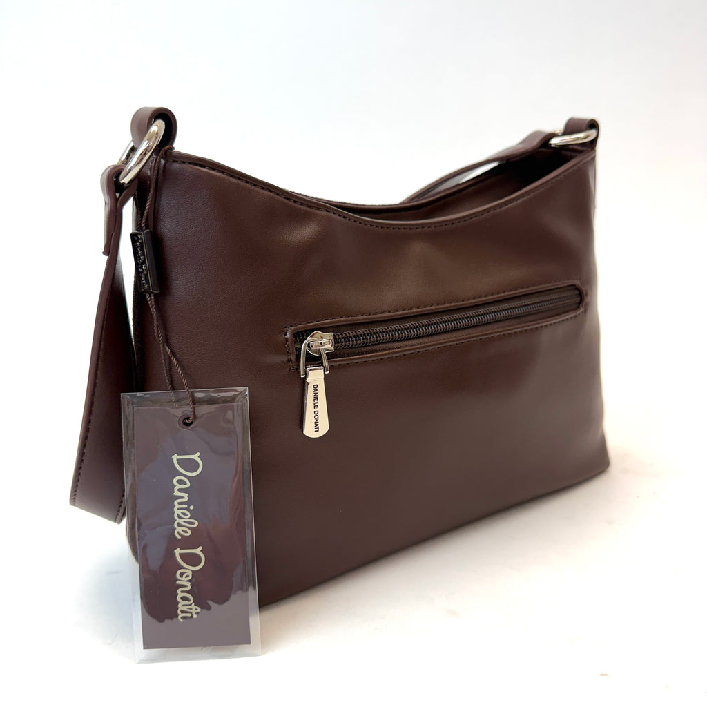 Sopivan kokoinen olkalaukku keinomateriaalia, toinen puoli mokkamainen ja toinen sileä. Kiinteä pikkuhihna ja irrotettava pidempi säädettävä hihna. Vetoketjutasku ulkona ja sisällä. Sisällä myös pikkutasku. Koko 29 x 19cm.