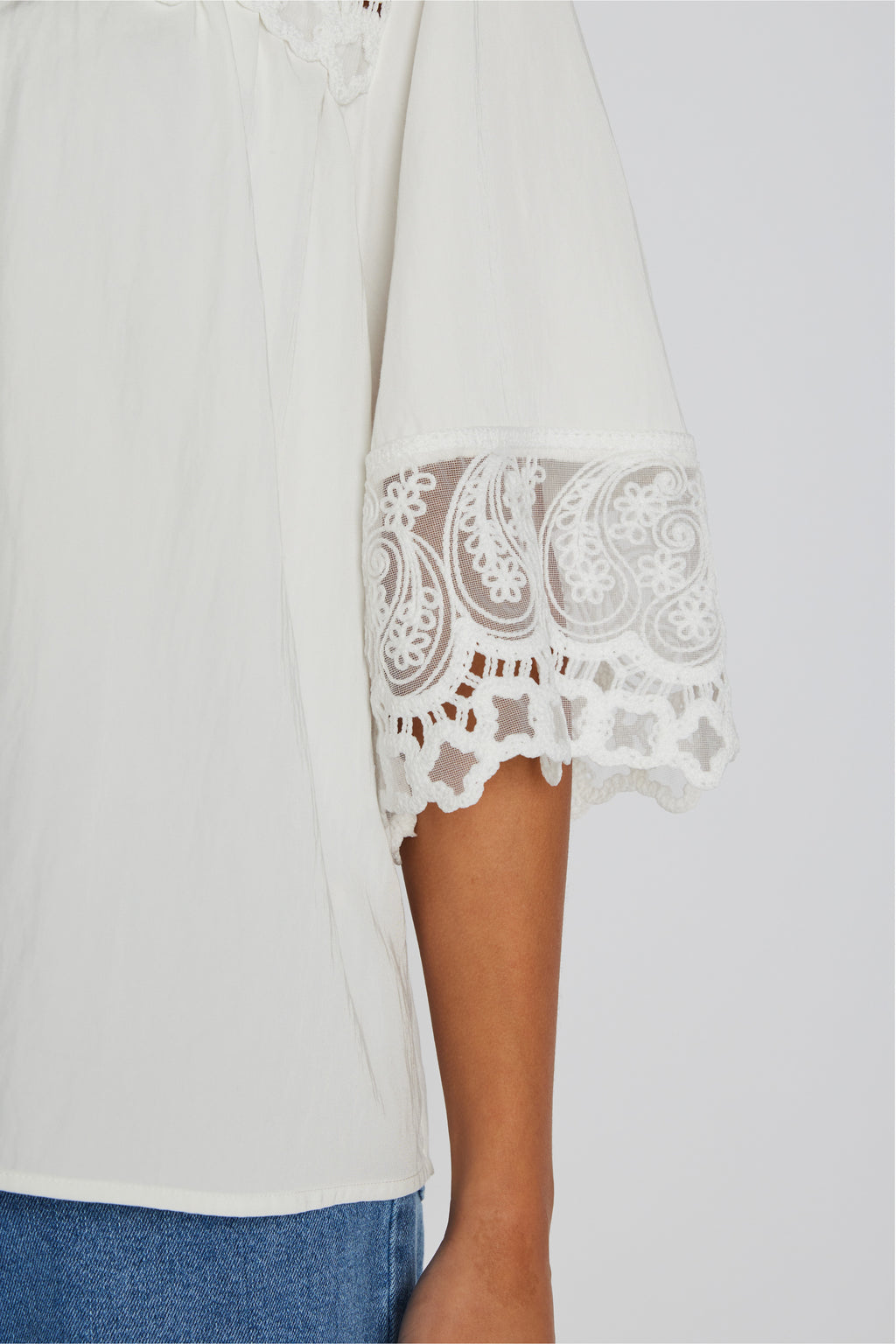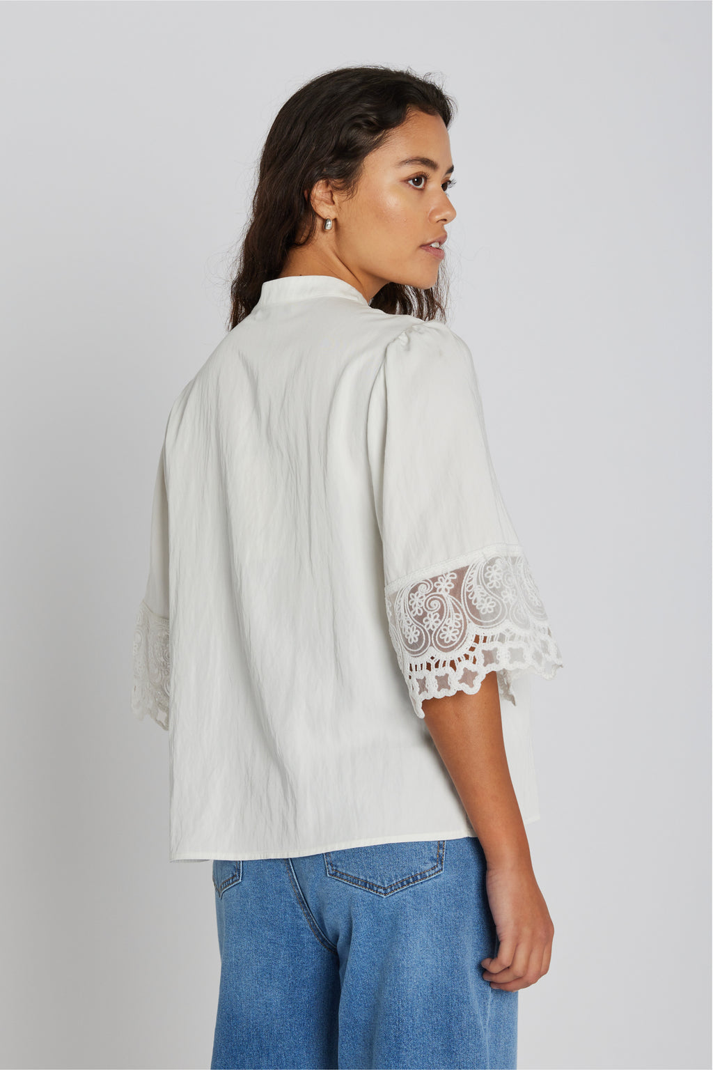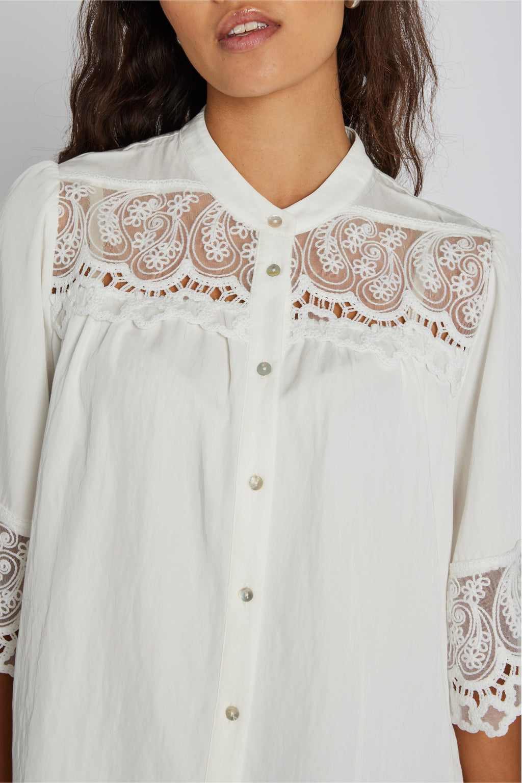 Herkkä pitsipaita, lyhyet ja leveät hihat, joissa kaunis leveä pitsi. Yläosassa läpikuultava pitsi, napit alas asti. 70% viskoosi, 30% polyamidi, pesu 30 astetta, voi kutistua 5%.