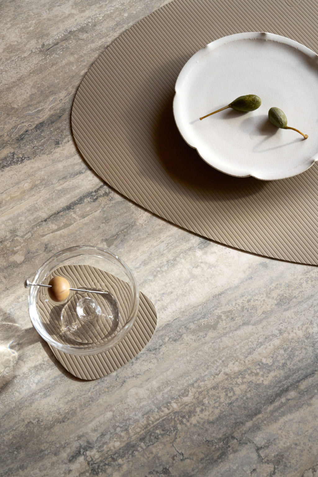 LIND DNA Corduroy-mallisto tuo pöytäkattaukseen uudenlaisen kierrätysnahkatekstuurin, joka on saanut inspiraationsa ajattomasta vakosametista. Sen käsin kohokuvioidut vaakasuuntaiset linjat luovat syvyyttä ja tyylikkyyttä, kun taas pehmeä ja sileä pinta tuo ylellisyyttä sekä arki- että juhlakattauksiin.