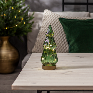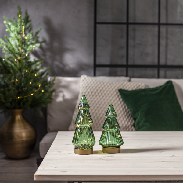 Led-lasikuusi, korkeus 24cm. Toimii 2 x AAA-paristolla (ei mukana). Ajastintoiminto.