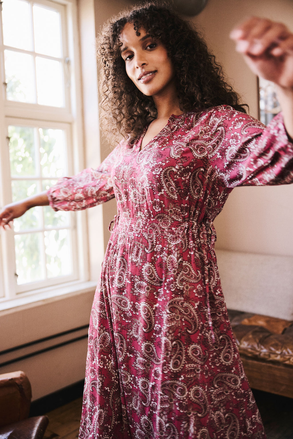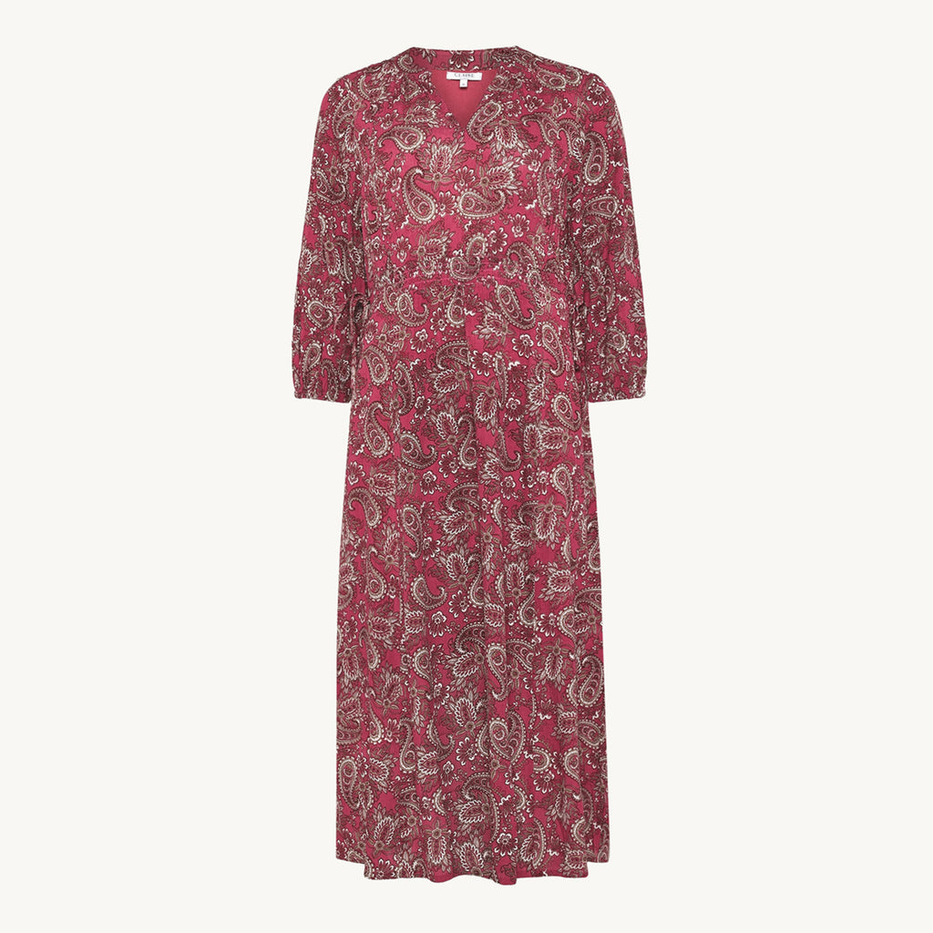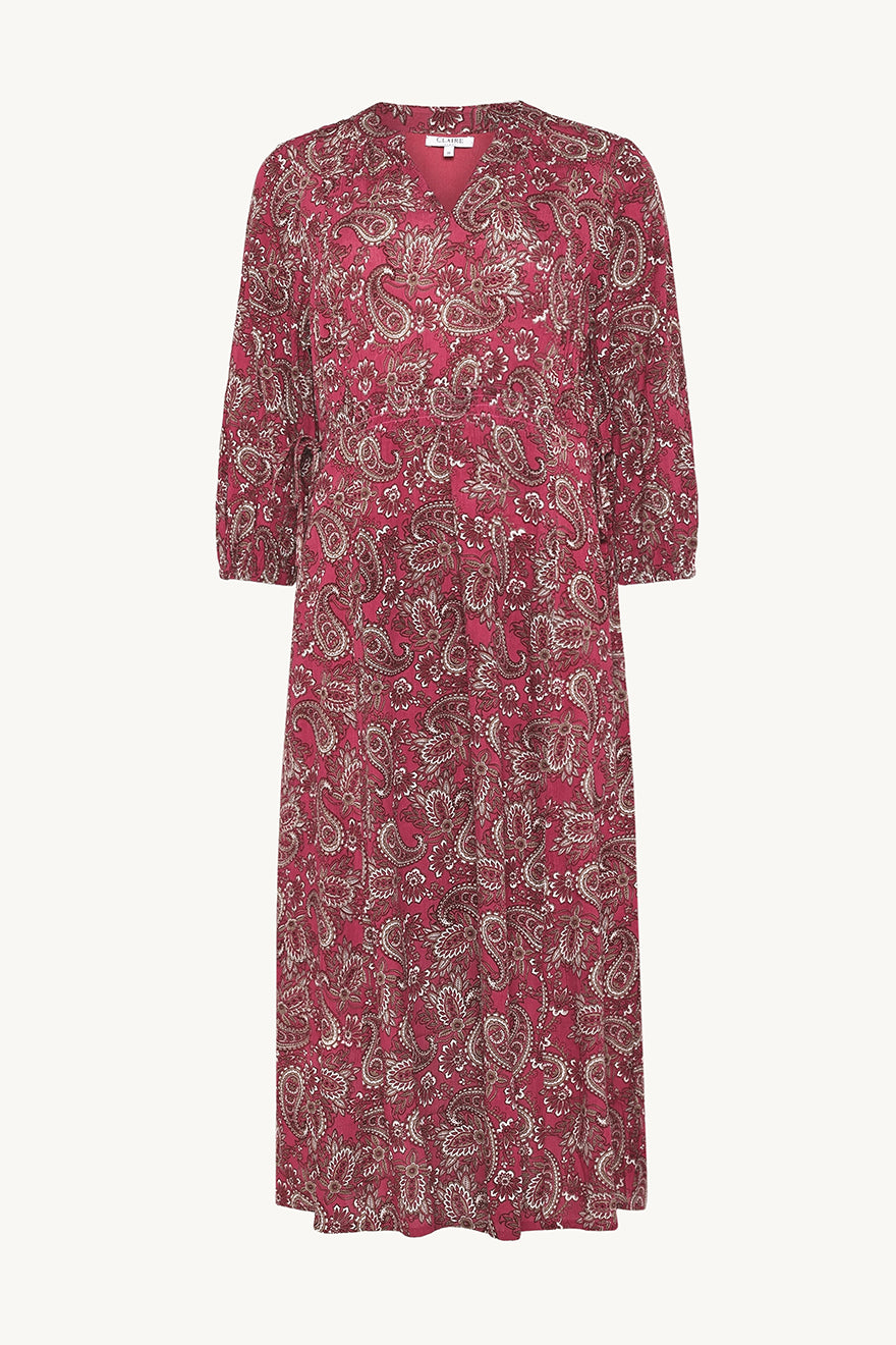 Kaunis taskullinen, paisley-kuvioinen mekko. Vyötäröllä kuminauha ja sivuilla kiristysnyörit. Sopii hyvin monenlaiselle vartalolle. 3/4 -mittaiset hihat, hihansuissa kuminauha. Vuorikangas. 100% viskoosi, pesu 30 astetta, voi kutistua max. 3-5%.