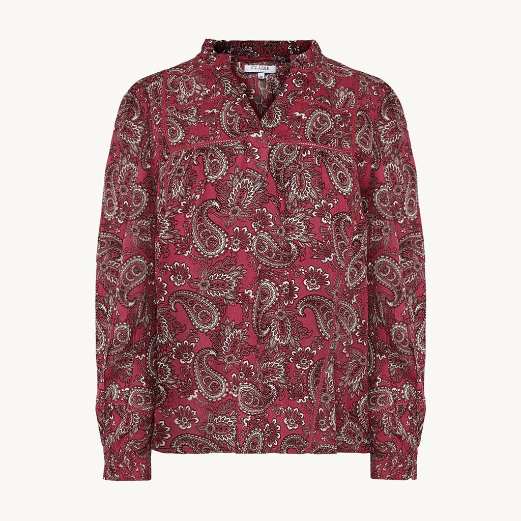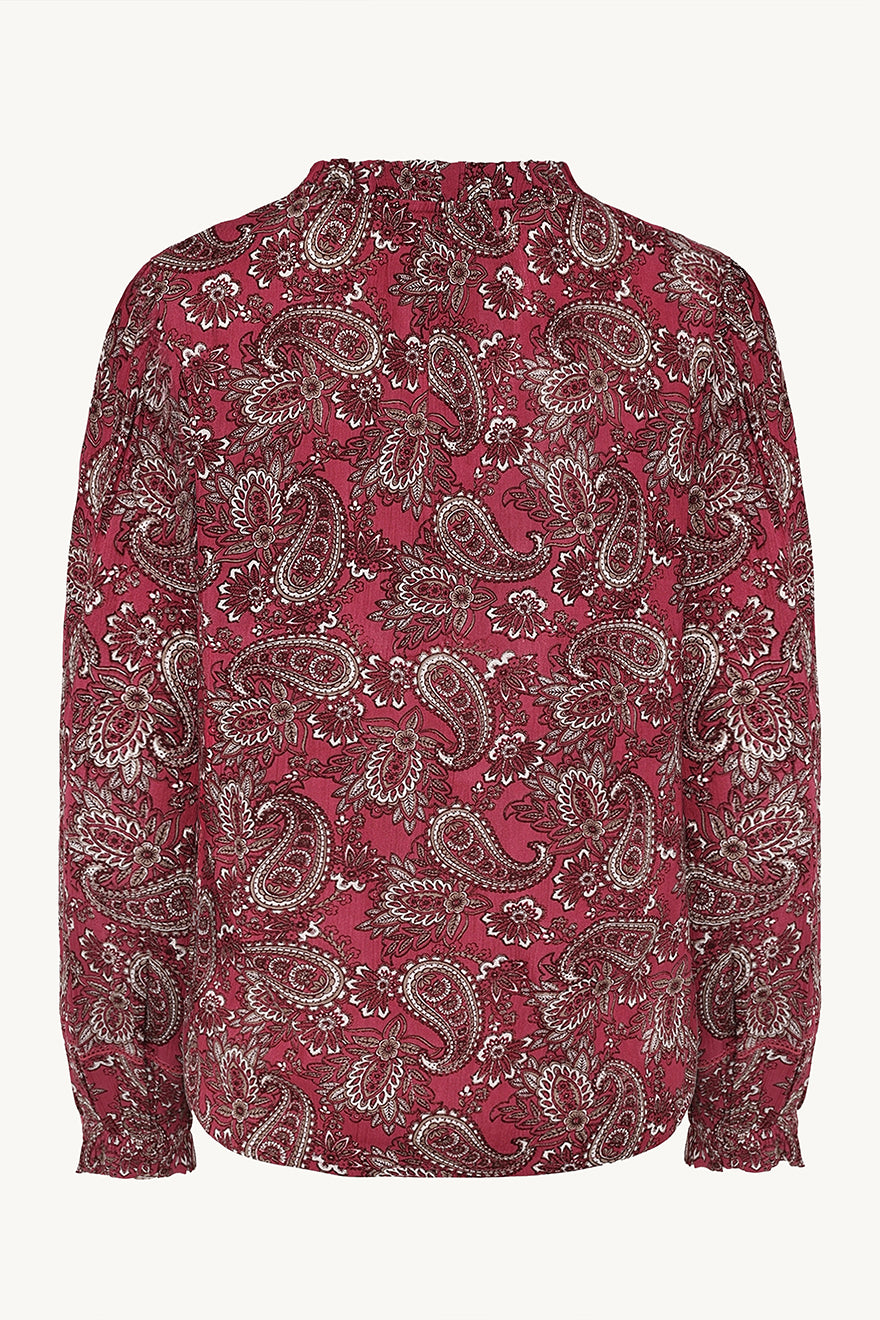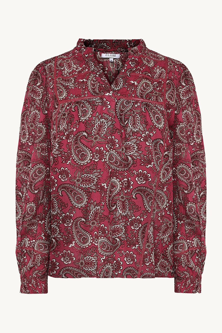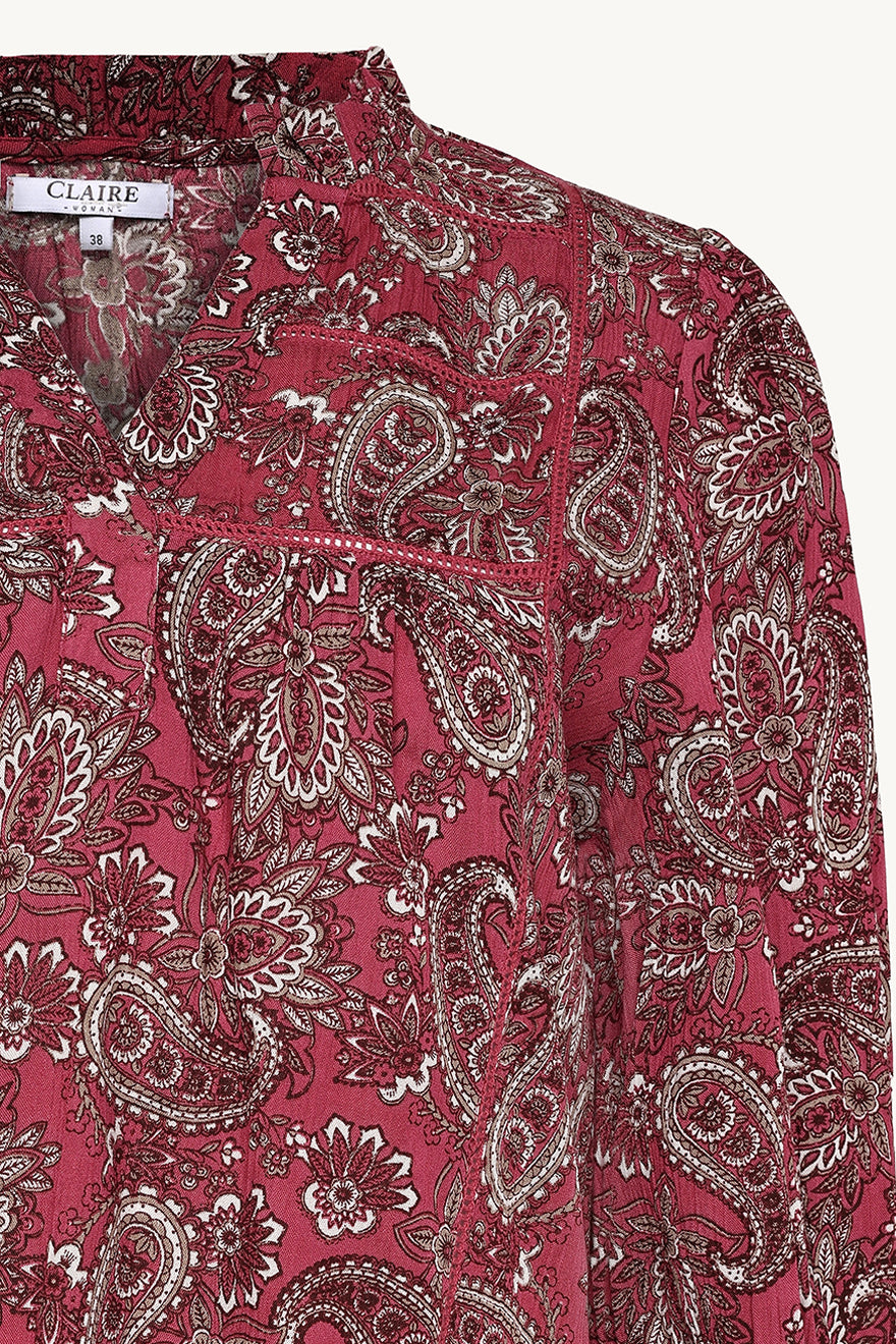 Kaunis paisley-kuvioinen paita. Pyöristetty helma, hihansuissa smokkirypytys, pitsikoristelu edessä. 100% viskoosi, pesu 30 astetta, voi kutistua 3-5%.