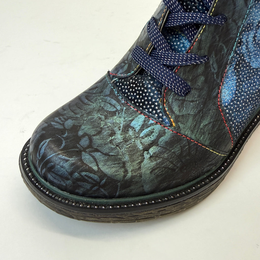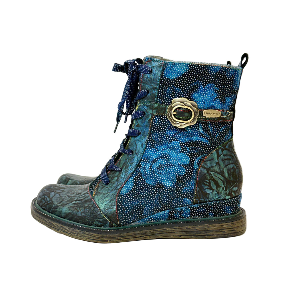 Upea, sininen, tyylikkäästi kimaltava hyvälestinen nahkanilkkuri. Kiilakorko, pehmeä kangasvuori. Allekirjoittaneella on tästä aiempi väri, pehmenee käytössä todella miellyttäväksi! Sivulla vetoketju, toisella sivulla koristesolki. Pohja ei ole liukkaan kelin pohja.